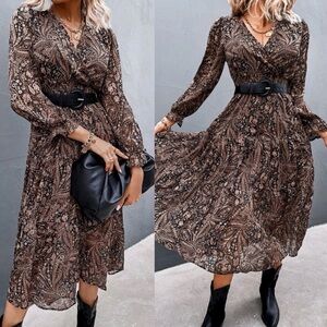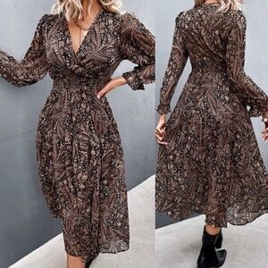 Long sleeve v neck paisley shirred ruffle maxi dress brown boho gypsy