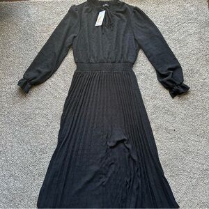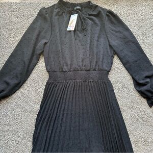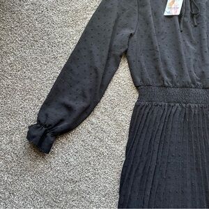 Long Sleeve V Neck Swiss Dot Pleated A Line Flowy Black Dress Wedding Formal
