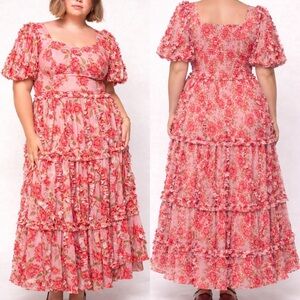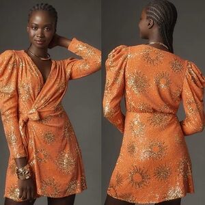 This dress is in euc. It has a few loose sequins. It has a raw hem so the loose threads are located there.