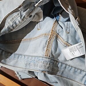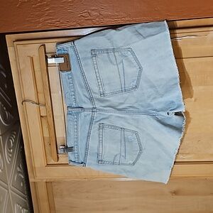 Here is a pair of American Eagle Women's Distressed Blue Cut Off Denim Jean Crochet Mom Shorts Size 10. They are in good condition with the exception of a little wear and a very minor tiny spot as shown in the picture, not very noticeable, but has lots of life left. The waist all around is approximately 32 inches and the inseam is approximately 3 inches.