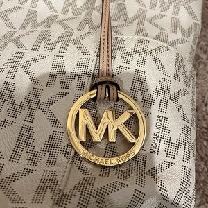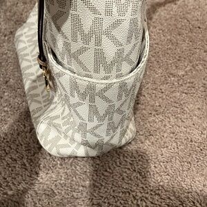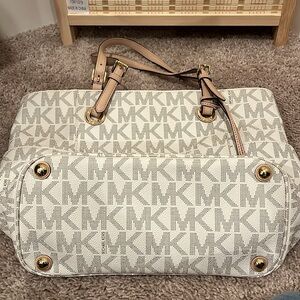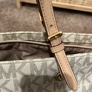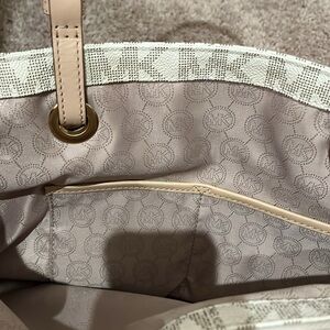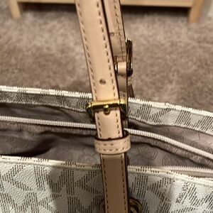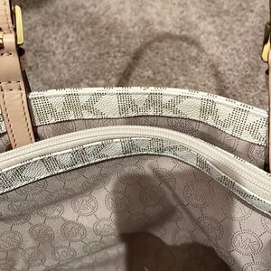This is immaculate and like new. Used a couple of times. I have a bad shoulder and it’s too heavy. It has a zippered middle compartment and many inside pockets. It has real leather trim.