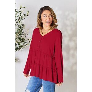 Double Take Half Button Long Sleeve Ruffle Hem Blouse
