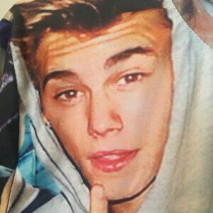 Totally unique TShirt. Slinky retro fabric with montage of fan photos of Justin Bieber as a teen idol. Labeled L but runs small, may have been Child L. No fabric or wash labels but would probably be Hand Wash, Hang to Dry. Writing a memoir.