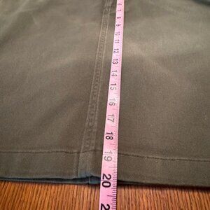 Are you looking for a casual skirt to wear from spring through fall -- even winter with some leggings? This is it! Izod well-makes this olive green twill into a perfect go-to skirt for nearly every season. Generously styled for size 12 ladies. 97% Cotton 3% Spandex. Length is approximately 20". Hem circumference is approximately 42". Waist circumference is approximately 36". There is a tiny pull at the back of the skirt near the hem (see final photograph).