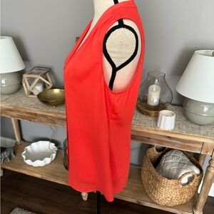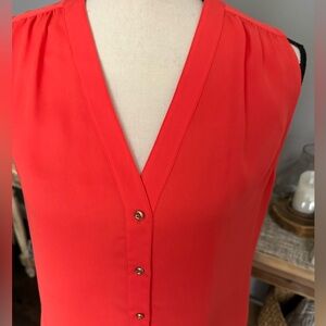 Beautiful sleeveless blouse. Gold buttons. Little pleaded texture by shoulder. The color is a little deceiving. It looks red in the pictures. However, it’s more like a coral/red combo.