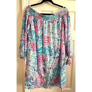 Cool-hued tropical fruits and flowers add to the fun-in-the-sun flavor of this long-sleeve shift dress with a smocked off-the-shoulder neckline. Style Name: Lilly Pulitzer Maryellen Floral Off The Shoulder Long Sleeve Dress. Style Number: 6269504.
