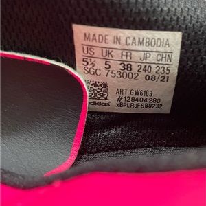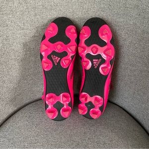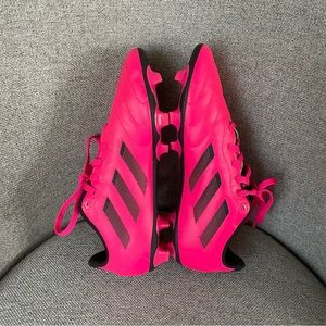 Adidas soccer cleats. Wore for one indoor soccer game. Great condition. Kids size 5.5 or women’s size 7. Hot pink color. Very cute and great fit for fast running on the field.