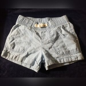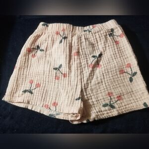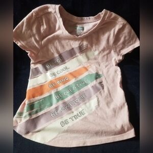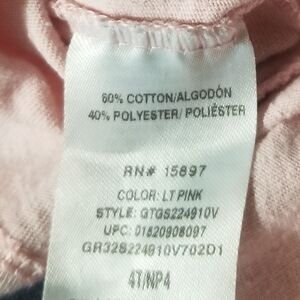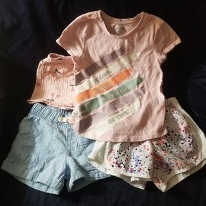 Four pieces of kids 4T clothing. First is a Garanimals pink shirt with inspiring words in stripes. 60% cotton, 40% polyester. Also pink are the Gerber quilted texture 100% cotton shorts with cherries on them.