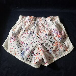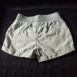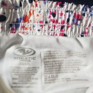 There's a pair of blue 100% cotton Wonder Nation shorts. You can put hands in the pockets, but I can't imagine anything else being in them for long without falling out. Then is a pair of white with bright spray paint pattern Athletic Works shorts. Polyester, with a drawstring on the inside.