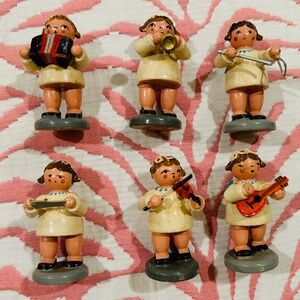 -IF YOU ARE FAMILIAR WITH THESE PIECES YOU KNOW THE OLDER ONES ARE HARD TO FIND! Handmade in Erzgebirge, Germany’s Ore Mountain region of Saxony, famous for its wooden toy making. East Germany, officially known as the German Democratic Republic was a country in Central Europe from its formation on October of 1949. Item is in vintage, pre-owned condition with some wear & chippy paint. Please examine all photos. These Orchestra pieces are wonderful for Christmas but do not scream holiday and can be used anytime.I ALSO HAVE LISTED SEPARATELY: Angel with Trumpet, Angel with Triangle, Angel with Sheet Music, Angel with Mandolin, and Angel with Violin-See all angels in photo 7. THESE PIECES HAVE NOT BEEN CLEANED.