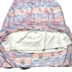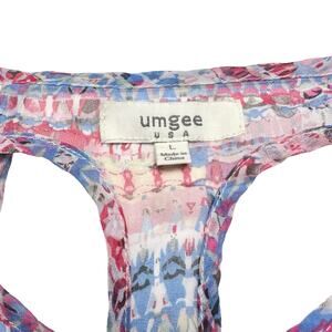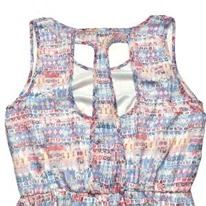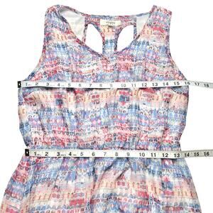 Pre-owned women’s Umgee pastel abstract print breezy Summer shift dress with a high low hem, elastic waist, full lining, and racer back detail. Very lightweight, breathable, and breezy.