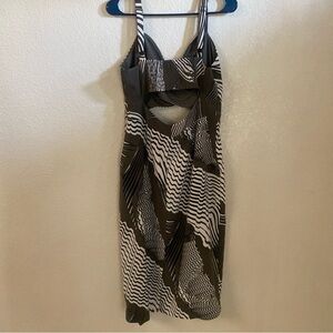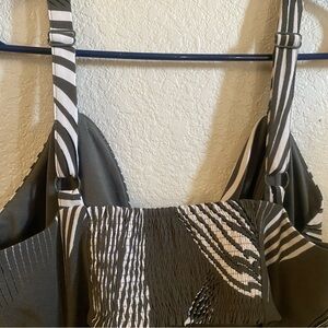 This dress is in pristine condition as it has only been worn once. There are no stains, pulls, or tears. It’s is a very flattering cut and is head Turner undoubtably. The color is a deep grayish green, white, and black. It has adjustable straps and the support in the breast area is superb so you won’t have to wear a bra. Feel free to ask questions or make an offer. Happy Poshing 😃