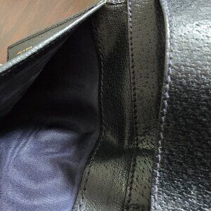 The inside has a spot for an ID, but as you can see from the picture that a small part of it is torn away from the wallet, however, if you know a good cobbler or shoe repair place, they should be able to fix it for you. Also, there are several card slots on the righthand side (9) nine to be exact. Three slots where you can either put your receipts and/or paper money as well. There is a little loss of color on the opening of the coin purse on the back of the wallet. Also there is another opening at the top of the wallet (take a look at picture no. 14) - I don't know what it's for. Also on the inside there seems to be a piece of the closing missing (picture 5) - maybe another emblem was at that particular spot (I don't know). A little separation on the bottom corner and some loss of color on the other bottom corner as well. From the Gucci Accessory Collection (Made in Italy).