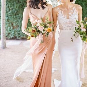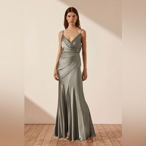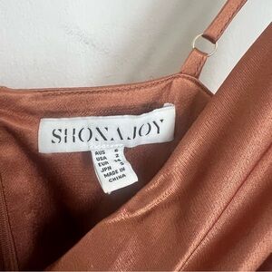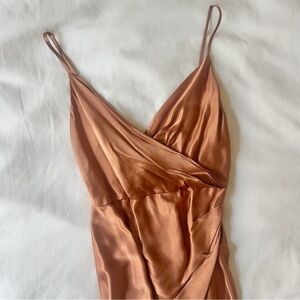 Shona Joy cross over cowl draped maxi dress in Copper - a beautiful rose gold / rust color that is now discontinued. Worn once and then dry cleaned, no noticeable flaws. Perfect for a bridesmaid or wedding guest. Note that the last two photos are of the same dress in a different color.