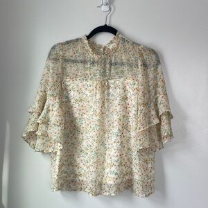 Loft size S navy floral print long sleeve v neck blouse with cuff sleeves.