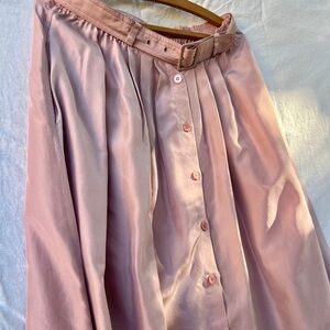Beautiful vintage dusty pink skirt! Feels incredible to wear. Pockets, working buttons, elastic band, belt included, probably not perfect but in excellent condition.