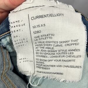 CURRENT/ELLIOTT The Stiletto in Powell. Size 30. Runs small in my opinion! Like new! Have some stretch to them. Only flaw is some threading has lifted on the back pocket, see last photo. 26” inseam, 9” rise, 15.5” waist laying flat.