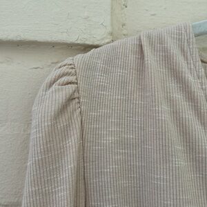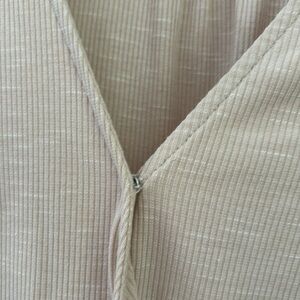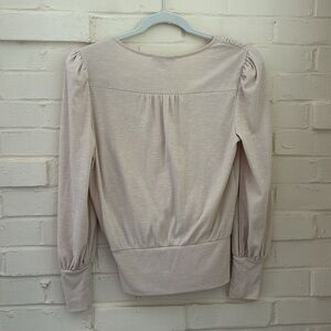 Allison Joy wrap top from anthropologie. Seen in a beautiful heathered beige color, this fabric is so soft and comfortable. Could be dressed up or down. Clasp at chest keeps it secure. Very small amount of padding at shoulders to keep its shape.