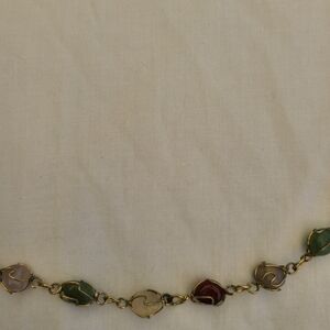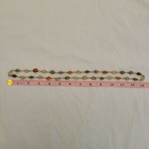 This is a one of a kind semi precious polished stone necklace. All of the stones are gold tone wire wrapped individually and connected. Many different colors for an interesting look. Green, purple, red, orange, white. Beautiful unusual natural boho vibe to this necklace. Looks nice with any colored blouse, shirt, or bare skin.