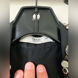 DESIGNER PRADA BLACK SHIRT W EMBROIDERED COLLAR size 44 but fits a 0 or 2 ! So don’t pay attention to the 44. Runs small! In amazing condition. So chic and timeless. Even though it looks fancy, it can be worn casual with jeans or dressed up with slacks or silk pants! Even tho it’s a 44 I listed as a 0 since it fits that way