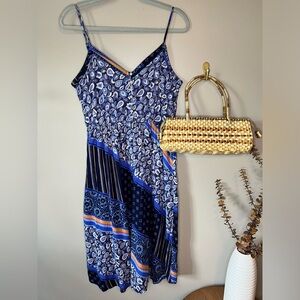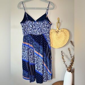Lined, super cute and comfy. Adjustable straps. Some stretch through band below bust. Loved the patchwork design and button details