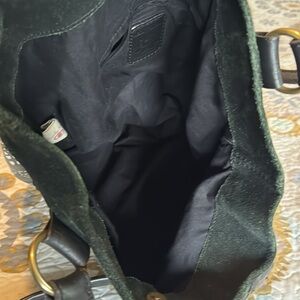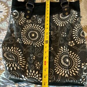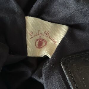 Lucky Brand Bag Cotton With Suede Trim. Preloved good condition with some signs of use. See photos for details on condition. Great bag that holds lots of double strap with magnetic snap closure. Zip pocket and a couple slot pockets inside with a snap loop to hook your keys.