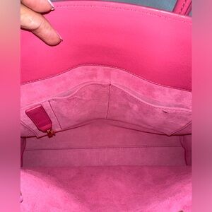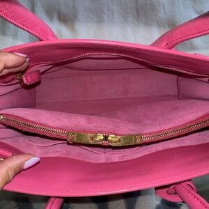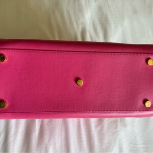 This is an authentic SAINT LAURENT Calfskin Small Sac De Jour Lipstick in Fuchsia. This elegant tote is crafted of luxuriously smooth leather in hot pink. The bag features rolled leather top handles, an optional leather shoulder strap, and short side straps that can be undone to increase the width of the bag. The top opens to a pink microfiber interior with a central zipper compartment, zipper pocket, and patch pockets.