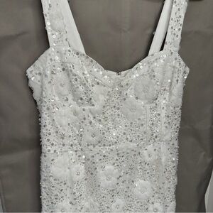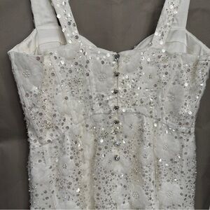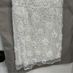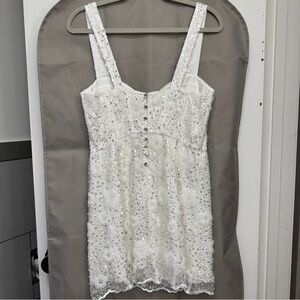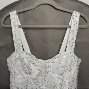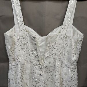 A sweetheart neckline tops this a-line mini embellished with white and silver beads to create a gorgeous floral pattern. Dainty buttons down the back sweeten the look.