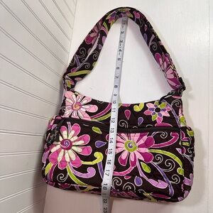 Pretty floral print Vera Bradley purse. Double layer shoulder strap. Large outer zipper closure pocket. Zipper closure for main section. Three pouch areas on the inside. In good condition.