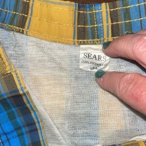 EUC Vintage Men’s 1960’s swim trunks. Yellow blue and black plaid, small pocket on right side at waist, 2 button closure with metal zipper. Elastic at waist. Rise is 13”, inseam is 3”, waist 17”. Made in the USA. Sears brand with a light weight mesh lining.