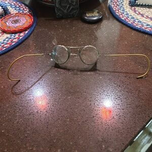 Vintage 1940 safety glasses great for riding motorcycles has adjustable nose piece and arms that fold out with screen sides and glass lenses very nice for age