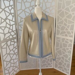 St. John jacket in a window-pane design. Royal blue and white. Top clasp closure. Size 4. Very good condition. Great with white jeans!