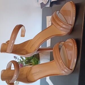 Kenneth Cole Sz 8 Beige with gold sole trim Ankle Strap open toe 4" heel
