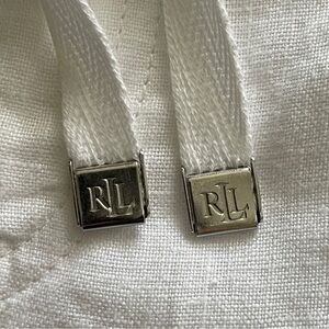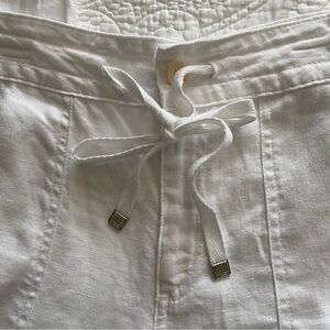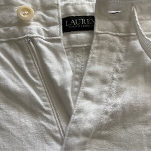 Lauren by Ralph Lauren 100% Linen Wide leg White pants Size 6. Zip and button closure with additional ties with RL engraved accent tabs on ties. Front and back pockets. Wide leg. In great pre-owned condition. 16” flat lay at the waist. 31” inseam. 11” wide at the bottom of hem.