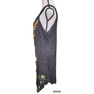 Introducing a beautiful black boho dress from Exist. This dress features a floral pattern, sleeveless design, and a round neckline. The pullover closure makes it easy to wear, and it's perfect for travel or casual occasions. The dress is made of lightweight rayon fabric and is machine washable for easy care. It has a collarless design and no sleeves, making it perfect for summer, fall, or spring. The dress is one size fits all and is perfect for women who love the beach, hippie, or bohemian theme. The dress is made in India and is not hand-made. Get your hands on this stylish dress and make a statement wherever you go. CLOTHING AND FABRIC ITEMS: All clothing and fabric items have been steam cleaned and/or washed. Crochet Area on sleeve open approx 2".
