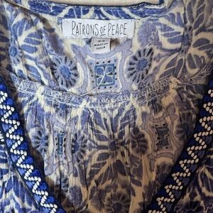 This whimsical Patrons of Peace blouse comes across as feminine and flouncy but not overdone. This cotton rayon blouse is so charming with classic peplum silhouette with a twist of different print mix & V heart neck. The neckline is creatively adorned by embroidery that extends throughout the bodice to the flowy hem. You can either dress it up with some sleek skinny denim or dress it down with some shorts for relaxed and distressed weekend vibe. This shirt has all the details of a romantic, summer beach piece with the quality to match.