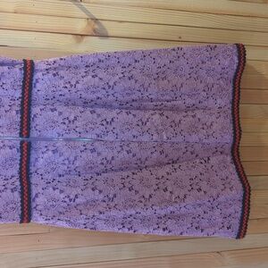 Beautiful lace dress by Gucci. Lace overlay with red and navy detail trim and gold/pearl front buttons. Silver back zip closure. Size 44