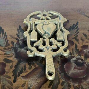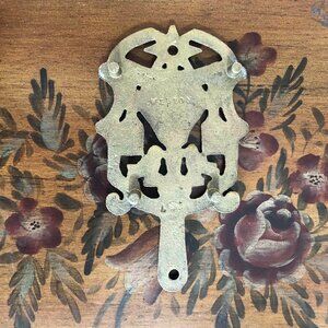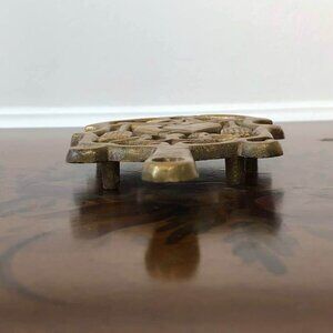 Classic old 4 footed trivet has some patina but it’s in good shape. It does have a slight wobble, so it’s probably best to set on a place mat of sorts. Very nice used little trivet.
