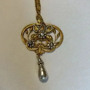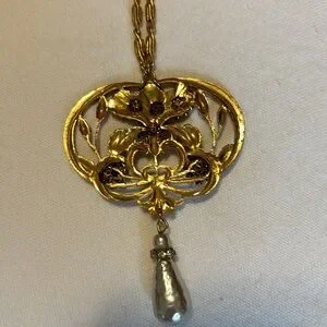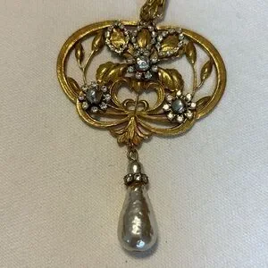 This is THE ONE fashion necklace that everyone is looking for and I found in my beloved cousin’s unworn collection! 28 Inch Stunner with Goldtone pendant with pearl and CZ accents. 4 inch added chain with clearly marked Nameplate of designer makes this a versatile piece as well. Incredible drop pearl at the bottom is 2 1/2 inches. Get this fast! It will not last!