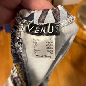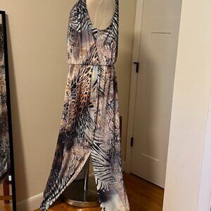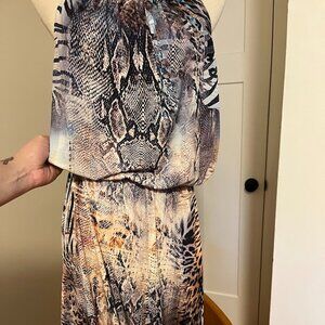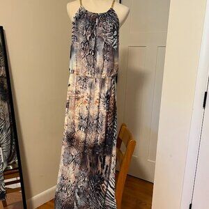 This luxe maxi combines elegance with exotic flair, thanks to its beautifully blended mix of stripes, spots and scales, held up by luxe chain straps. Hits above the knee 34.5" at shortest point. Maxi 58" at longest point