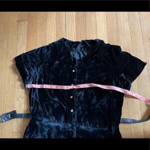 A beautiful classic shape circa 1940s! Made of black silk velvet, this is a short sleeved shirt dress that is belted with a hidden metal zipper down the front and square shaped decorative rhinestone buttons down the front. Handmade with measurements in photos - approximately a medium. This dress is in good condition considering age. It has a few minor pinholes throughout. The belt is odd - the buckle comes unattached - but functional.