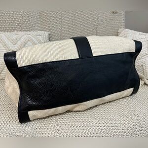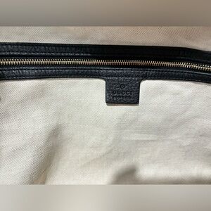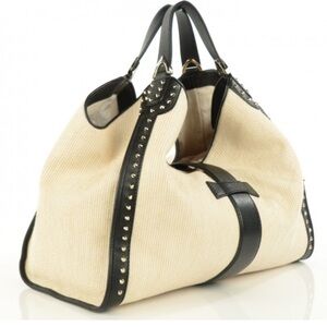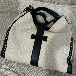 This is an authentic GUCCI Straw Large Soft Stirrup Shoulder Bag in White. This stylish tote is crafted of straw with black leather trim. The bag features black looping leather strap handle with small spur hardware, a black crossover strap with a large spur buckle and silver studs lining the edges. The top opens to a natural fabric interior with a zipper and smart phone pockets. This is a marvelous tote for your essentials, from Gucci!