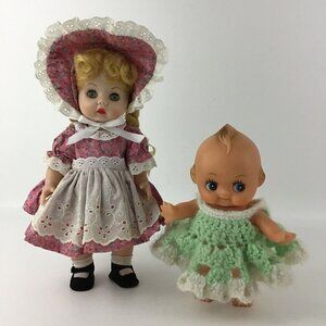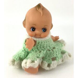 Also including this adorable 8” kewpie style doll, jointed rubber, says made in Taiwan on back, no other markings. Has some age wear & markings. Comes in cute green knitted dress.