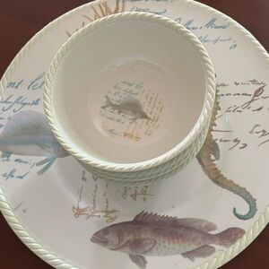Melamine platter and 4 bowls . Beautiful pattern from Frontgate. These are heavier than most melamine dishes. Platter is large- 14” diameter and bowls are 6” diameter and 2 1/2” high. These were never used.