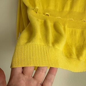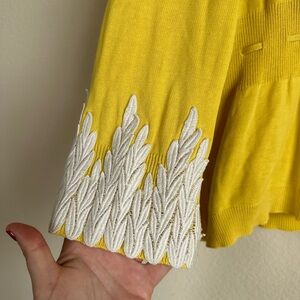 Anthropologie Moth Twee Cotton Lace Knit Cardigan. Yellow cotton knit, with white thicker lace embroidered trim. Laced waist cinch tie.