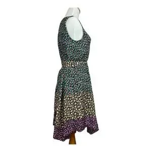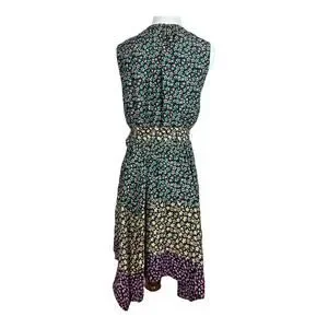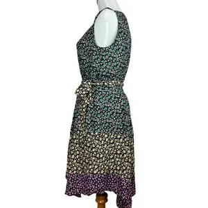Beautiful silk floral sleeveless dress by Rebecca Taylor. Dress features handkerchief style hemline, elastic waist with complimentary sash, tiered floral design, a keyhole opening on back neckline, and is fully lined.