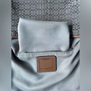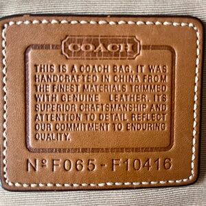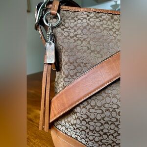 Crossbody mini tote features rich leather bottom, trim, strap and detachable tassel paired with signature Coach canvas and silver tone hardware. Bag has top zipper closure and one silver metal hang tag. Strap is adjustable and via chunky buckle on either size. Interior of bag has 2 slip pockets and one size pocket.