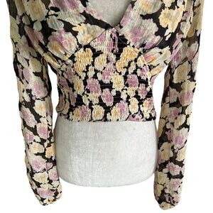 Lulus Romantic Impression Black Floral Smocked Tie Back Cropped Top - M