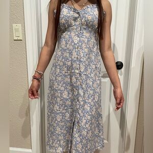 100% linen beautiful embroidered design with sheer material behind the embroidery. The neckline design is sexy goes down and has closure’s. Side pockets for your convenience. Excellent used condition. Like new.