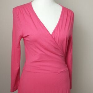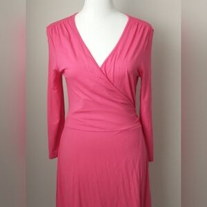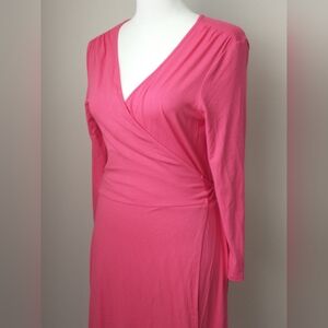 This comfy and colorful knit wrap dress by banana Republic has a v-neck, 3/4 sleeves and and a flattering a-line skirt. It's made of pink jersey knit material and is on excellent, like new condition.